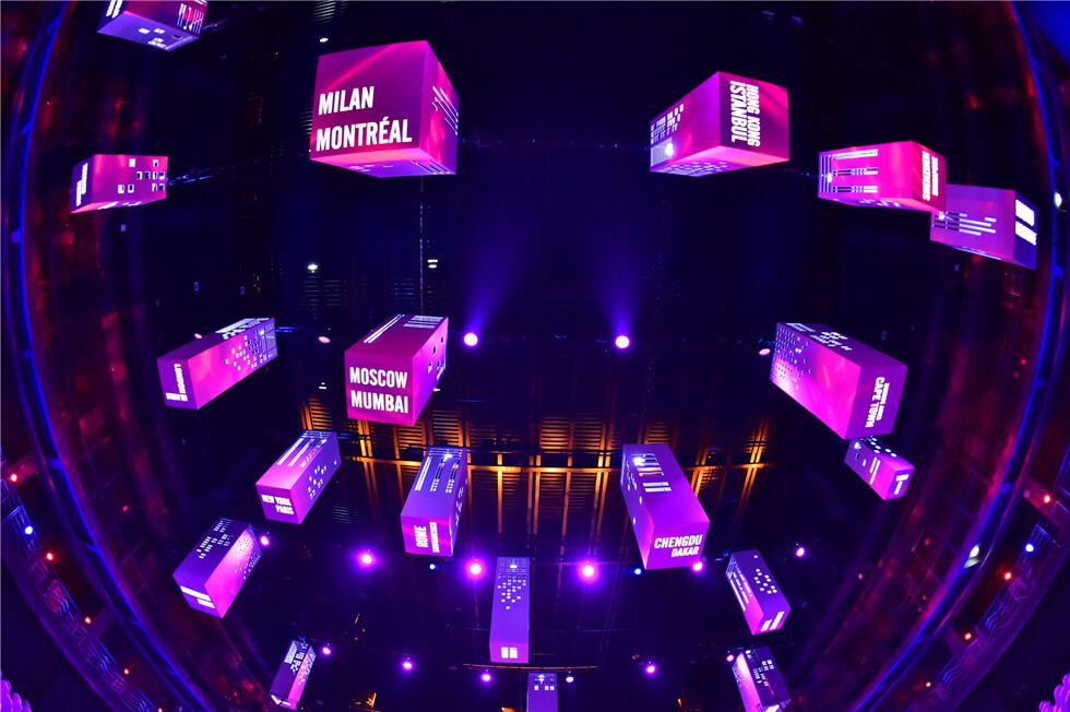 励翔在设计创新的同时,保留东郊记忆原有工业风的氛围。主会场内舞台的LED屏和投影采用全吊点,利用东郊记忆层高优势和对空间的充分理解,用不同的盒子造型打造出城市群落,每个“盒子”底部都印有两座世界文化名城成员城市的名字,五彩斑斓的灯光映射出美丽城市形象,也完美地对天府之国作出了富有创造力的阐释:天府之国即天上的城市。利用这一概念打造出一个繁华、包容的城市轮廓,创造出一座美轮美奂的天空之城。